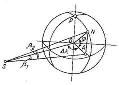 - разность долгот точки N и подспутниковой точки ИСЗ; R – радиус Земли (ОN), r – радиус геостационарной орбиты; d – наклонная дальность для точки N (длина линии SN). Данная