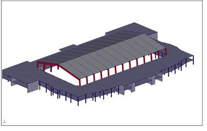 Для определения действительной работы несущих конструкций данного здания была создана расчетная схема, алгоритмы построения расчетных схем приведены в работах. На рисунке 2. Представлена модель здания в вычислительном комплексе SCAD.