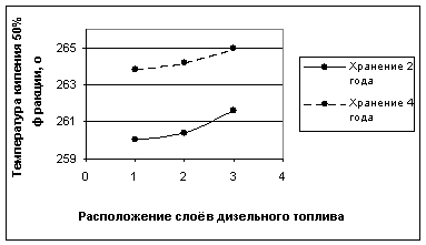 Симбатно снижению цетановых чисел ДТ происходит увеличение температуры выкипания 90 %-ной фракции дизельного топлива по глубине слоёв отбора проб от верхнего (1), к среднему (2) и нижнему (3) в подземном хранилище, при времени хранения 2 и 4 года, как показано на рис. 3.