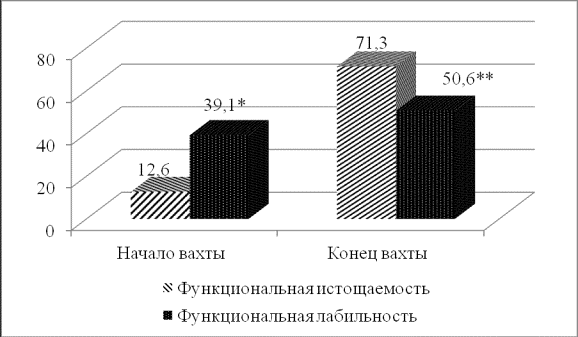 рабочих в процессе вахтового труда (%);* - р=0,01; ** - р=0,001