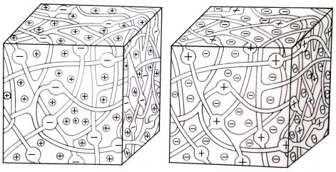 Трёхмерная модель структуры катионита (а) и анионита (б) [2]