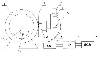 ЕОМ; 7,10 – поворотні ручки; 8 – вал; 9 – відлікова шкала; 11 – прижимні гайки