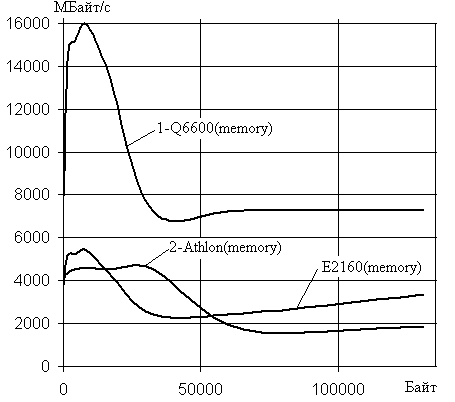 массивами для трех разных систем с процессорами: Q6600 (1-я кривая), Athlon 64x2