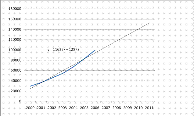 Рис. 1. Динамика развития и прогнозное значение розничного оборота в сельской