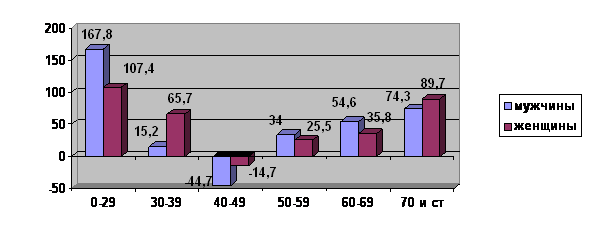 74,3% , снижение у мужчин возрастных группах 30-39 лет на -44,7,%, у женщин 0-29 лет на 107,4%, 30-39 лет на