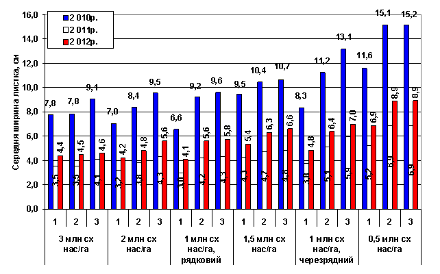 млн шт/га схожих насінин та черезрядний (30 см), відповідно 1,5, 1,0, та 0,5