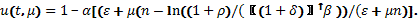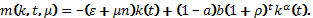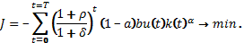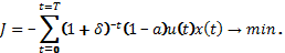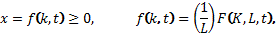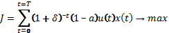 Подобная задача (для непрерывной момент времени t) рассмотрена в [2]. Предположим, что размеры конечного продукта определяются производственной функцией Кобба-Дугласа (используется дискретный аналог этой функции). Тогда производительность труда x определяется как [3]