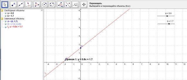 прямая вращается вокруг точки (0, а). Если работает ползунок b, она совершает параллельные переносы вдоль