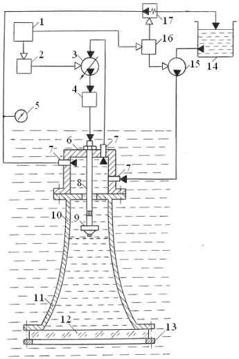 14 рабочей жидкости. В апертуре рупора 11 с помощью прижимного кольца 13