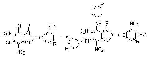 Для поиска новых биологически активных веществ нами были исследованы реакции конденсации 5,7-дихлоро-4,6-динитробензофуроксана с замещенными ароматическими аминами по схеме: