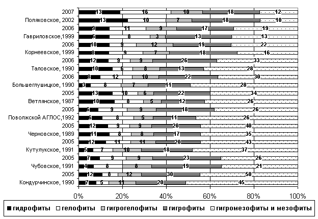 водоемов показал, что наиболее стабильными являются гелофиты и гигрогелофиты.