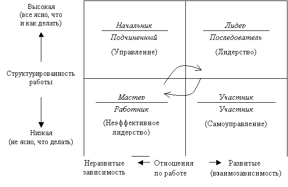Лидерские отношения типа «лидер-последователь» - это не административная деятельность и управление, которое ориентировано на то, чтобы люди делали вещи правильно, а лидерство – ориентированное на то, чтобы люди делали правильные вещи. Лидерство – это не железная рука, а высокая чувствительность к потребностям последователей, которая проявляется во включении их в деятельность коллектива, в делегировании им полномочий, чтобы делать их частью общего дела, а не слепыми исполнителями.