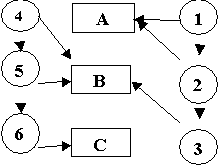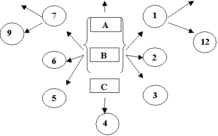 3. А – внешняя среда, В – промежуточный хозяин, С – окончательный хозяин, 1 – яйца,