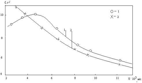 представлена зависимоть чfстоты пульсаций перепада давления от скорости газа в колонне
