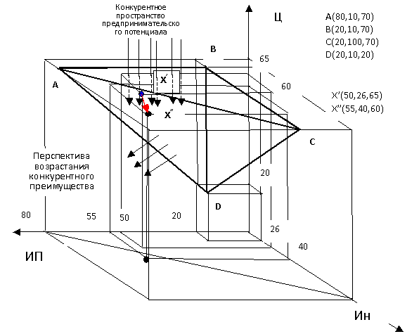 Конкурентное пространство ограничивается точками А(80,10,70), В(20,10,70),
