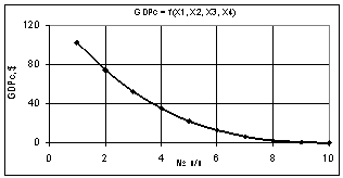 Рис. 1. GDPc = f(Х1, Х2, Х3, Х4) Х1 = Х2 = Х3 = 1, Х4 = 1…0,1 |