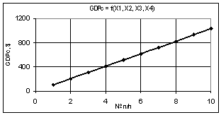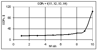 Рис. 4. GDPc =f(Х1, Х2, Х3, Х4) Х1 = 1…10, Х2 = Х3 = Х4 = 1 |