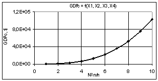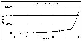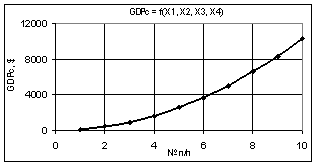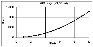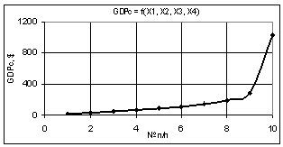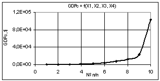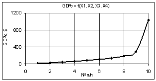 видно, что построенная кривая GDPc при переменных Х1 = Х2 = 1…10, Х3 = Х4 = 1 увеличивается значительно до величины