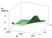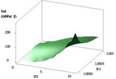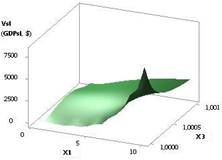 рисунках 3 и 4 показаны зависимости GDPsl = f(Х1, Х3), когда переменные были Х1 = 1…10,