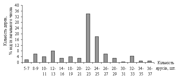 На рис. 1 представлено відсотковий розподіл дерев за числом ярусів гілок, що дає