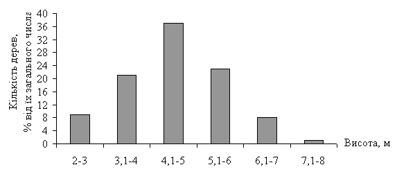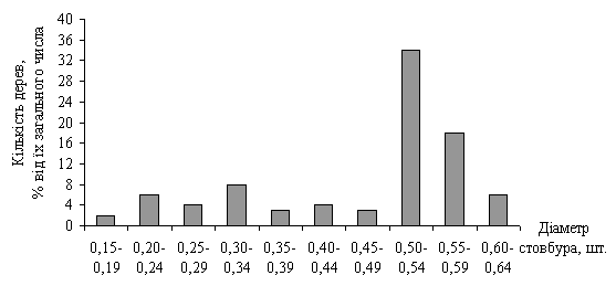 діаметром 0,50–0,64 м – 7,5 %. Число рослин з найменшими розмірами діаметру (0,15–0,24
