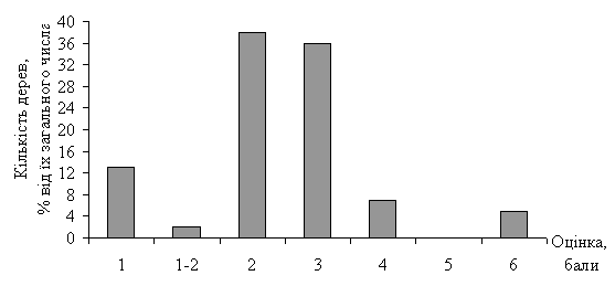 в 2 (37,8 %) та 3 (35,8 %) бали. Оцінку 2 мають дерева з ушкодженою хвоєю,