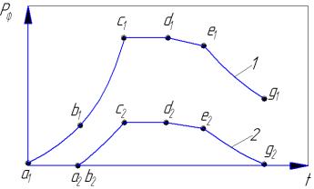 давления на входе в формующую полость (1) и у ее дальней стенки (2) в течение