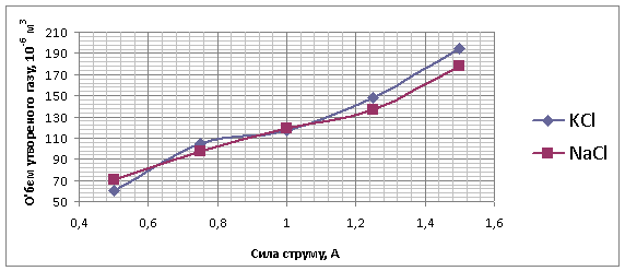 На рисунку 3 наведена залежність об’єму утвореної суміші газів від зміни сили струму.