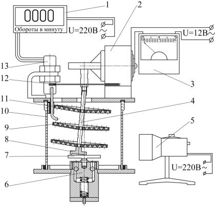 б) схема замера параметров: 1 – тахометр; 2 – мотор-редуктор; 3 – амперметр;