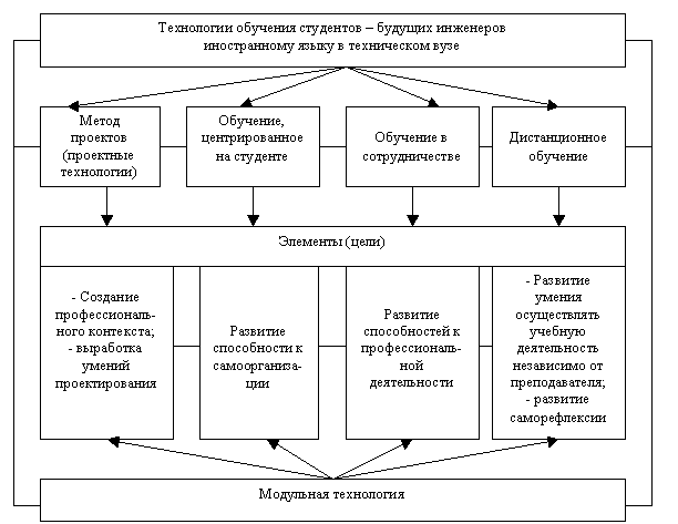 В ходе исследования пришли к выводу, что профессиональную подготовку студентов – будущих инженеров целесообразно осуществлять, пользуясь возможностями, предоставляемыми курсом иностранного языка, т.е. обучая их видам профессионально-ориентированной речевой деятельности на иностранном языке и формируя у них коммуникативную компетентность. В связи с этим проанализируем современные технологии обучения иностранному языку в техническом вузе. Поскольку в рамках Болонского процесса предполагается изменение организации учебного процесса в сторону самостоятельной образовательной деятельности студентов, обучение профессионально-ориентированному иностранному языку строится исходя из необходимости вовлечения каждого студента в активный познавательный процесс на всех уровнях овладения всеми видами речевой деятельности; создания естественного профессионального контекста деятельности, что непосредственно связано со способностью управления собственной учебной деятельностью. Поэтому к эффективным инновационным технологиям можно отнести обучение в сотрудничестве, метод проектов (проектные технологии), центрированное на учащихся обучение, дистанционное обучение, модульную технологию, поскольку все они рассматриваются исследователями как способы реализации на занятиях личностно-деятельностного подхода к обучению, в результате чего студенты выступают как активные творческие субъекты учебной деятельности.