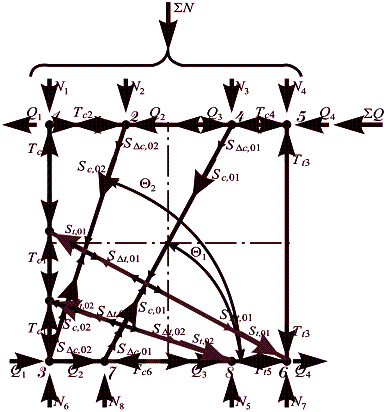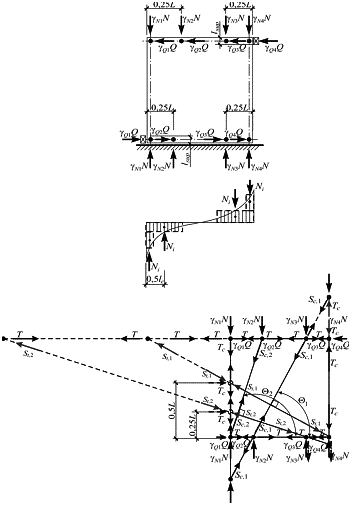 На пересечении указанных перпендикулярных линий с осью вертикального сжатого стержня образуются новые ключевые точки модели СМ. На пересечении рассматриваемых перпендикулярных линий с осью верхнего горизонтального элемента модели образуются новые лжеточки, которые располагаются за пределами расчетной модели и образуют замкнутую СМ, ломаного очертания, при расчете которой определяются усилия в элементах модели (рис. 1 и 2). Обобщенная модель является ферменной аналогией стен с различным соотношением сторон, а также с различным соотношением вертикальных и горизонтальных сил. Более удобной является упрощенная стержневая модель СМ кирпичных стен, рис. 2.