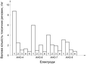 перше місце за токсичністю слід також віднести електрод АНО-4 (рис.3). При