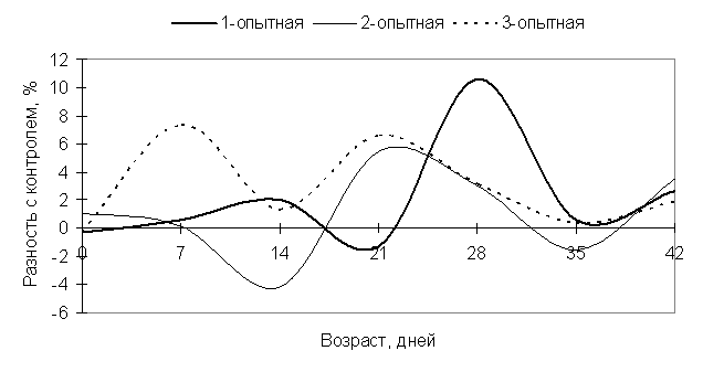 пользу опытных групп на 42-й день в 1,9 и 2,7 % соответственно. Для более