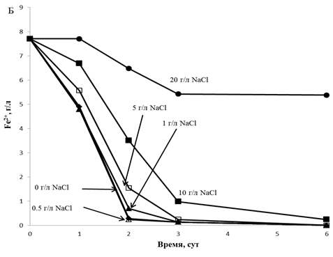 Зерттеліп отырған A. ferrooxidans штаммының қатысуында еківалентті темірдің тотығуына ортадағы NaCl концентрациясының әсері 1(А,Б)- суретте көрсетілген. Екі штаммен де темірдің тотығуын NaCl тежейтіндігін келтірілген мәліметтер көрсетеді. Екі жағдайда да 0,5 г/л және 1 г/л концентрациясы темірдің тотығуын сәл ғана ингибирлейді. TF1 Штаммы NaCl 5 г/л концентрациясында 1 тәулік лаг-фазадан кейін темірді белсенді тотықтыра бастайды, ал тотығу жылдамдығы NaCl аз концентрациясына қарағанда айтарлықтай төмен болды (алты күннен кейін тотығу NaCl 0,5 г/л және 1 г/л концентрациясындағы ортада еківалентті темір концентрациясының іздері ғана қалды, ал 6 тәу 5 г/л NaCl концентрациясында - 1,8 г/л Fe2+). 10 г/л NaCl концентрациясында темірдің тотығу жылдамдығы тіпті төмен болды (6 тәулік тотығудан кейін қоректік ортада 5 г/л Fe2+ қалып отырды). 20 г/л NaCl концентрациясында темір аз жылдамдықпен тотығады (6 тәулікте шамамен 0,5 г/л).