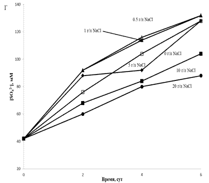 Сонымен, штаммдармен күкірттің тотығуы еківалентті темірдің тотығуына қарағанда натрий хлоридімен аз дәрежеде ингибирленгенін айтуға болады. А. ferrooxidans штаммымен темірдің тотығуы күкірттің тотығуына қарағанда хлоридтің өте төмен концентрациясында тежеледі, бұл бұрын алынған деректерге [3] сәйкес келеді. Бұрын зерттелген түрлердің кейбір өкілдеріне қарағанда [4] зерттелген штаммдар NaCl біршама өте төзімді екенін жалпы алғанда, алынған мәліметтер көрсетеді.