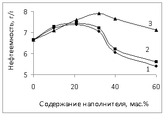 Рис.1 Зависимость нефтеемкости волокнистых сорбентов от содержания