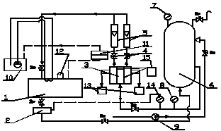 следующим образом. Из расходной емкости (1), через систему вентилей высокого