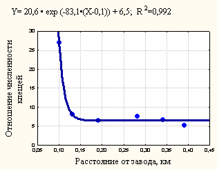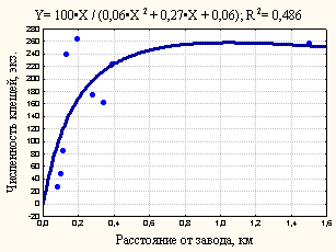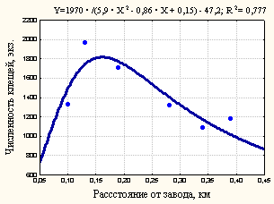 изменения численности клещей по градиенту известкового загрязнения отображался