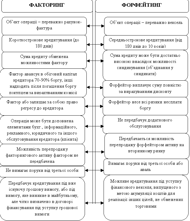 Недоліком факторингу є те, що відсоток за ним звичайно вище, ніж за форфейтинговими операціями, а також при форфейтингу банк купує векселі на всю суму та на повний строк, бере на себе всі комерційні ризики, без права регресу, що є більш вигідним для постачальника. Форфейтинг, так само, як і факторинг, є операцією з продажу дебіторської заборгованості, проте між цими операціями існують суттєві відмінності, порівняльна характеристика наведена на рис. 1.