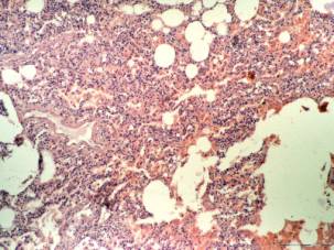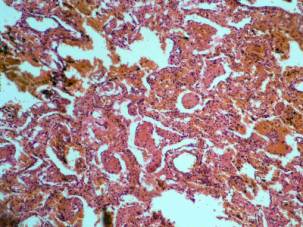 Рис. 2. Микрофотография. Сепсис 14 суток. Отек, уплотнение и консолидация легочной ткани, геморрагии, инфильтрация. Окраска гематоксилином и эозином. Ув. 100. |