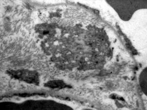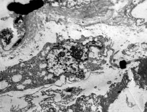 Рис. 4. Электронная микрофотография. Сепсис 14 суток. Зрелый фибробласт с морфологическими признаками деструкции находится в расширенном за счет отека и коллагенизации интерстициальном пространстве (стрелка). Ув. 6000. |