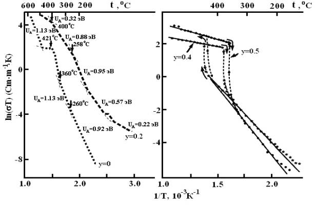 Fig.2. The temperature dependence of the conductivity of Li0.12Na0.88TayNb1-yO3