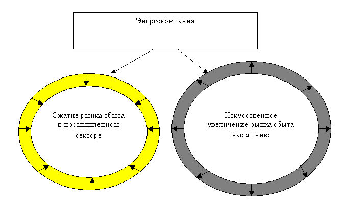 Не менее актуальной проблемой, на наш взгляд, является скрытая монополизация рынка. Существующий рынок сбыта энергии как единое целое можно разделить на две его составляющих части: а) рынок сбыта энергоресурсов населению; б) рынок сбыта энергоресурсов промышленности. В условиях кризиса, когда происходит сжатие экономики, происходит уменьшение продажи энергии в промышленном секторе, энергетические компании будут стремиться к сохранению достигнутого уровня сбыта. За счет чего можно достичь такой цели? Ответ очевиден, за счет расширения рынка сбыта энергоресурсов населению. Схема 2. Метод искусственного увеличения количества энергии.