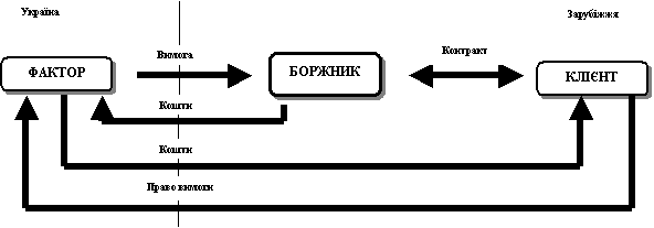 Так, зокрема, проблемна ситуація складається у випадку, коли під час факторингової операції фактор знаходиться на території України, боржник та клієнт – за кордоном (див. рис. 1).