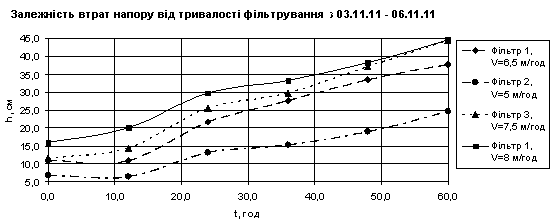 залежності Δh= ƒ (t, vф) фільтроциклу тривалістю 3,5 діб