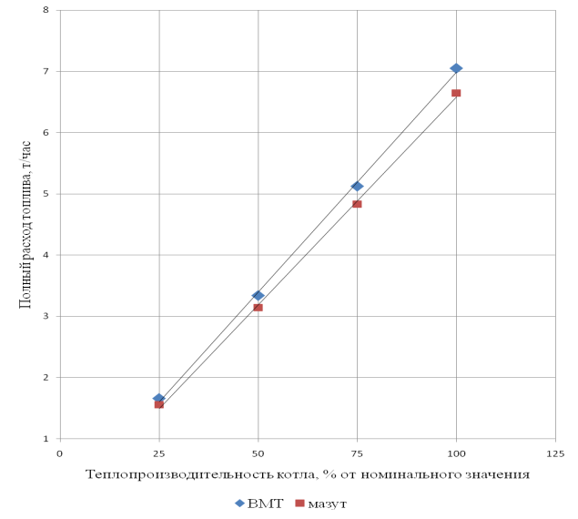 состояние, в зависимости от производительности при сжигании мазута и ВМТ представлен на рисунке 2.