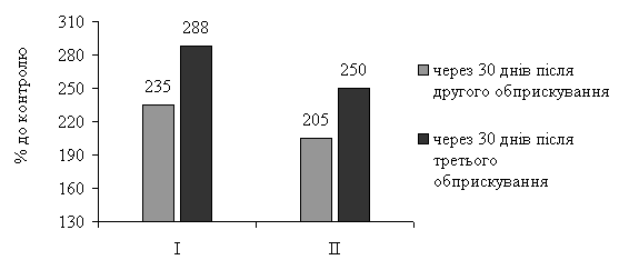 дистильованої води). Рослини обприскували трикратно. Першу обробку проводили у