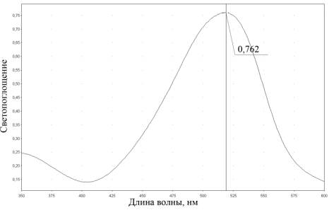 Для проведения анализа в стакан объемом 50 мл отбиралась аликвотная часть исходного раствора с содержанием свинца в интервале от 10 до 100 мкг, добавляли 15 мл буферного раствора №2, 15 мл раствора дитизона. После чего в течении 45 минут вели экстракцию. Органическую фракцию собирали в 25 мл мерной колбе при помощи делительной воронки и доводили до метки четыреххлористым углеродом. Спектрофотометричекое определение проводили в кварцевой кювете толщиной 0.997 см. Кривая снималась относительно холостой пробы – четыреххлористого углерода. Определение производили в интрвале 350 – 600 нм, в интервале интенсивности от 0 до 6.