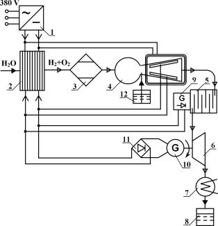 the electrolyzer through the rectifier 11. Then water vapors are fed into