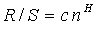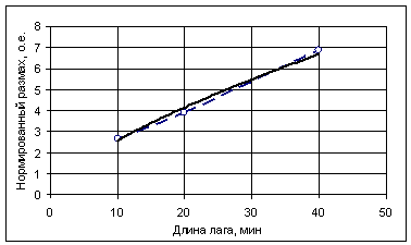 нормированного размаха от длины лага – прерывистая линия и её аппроксимирующее выражение,
